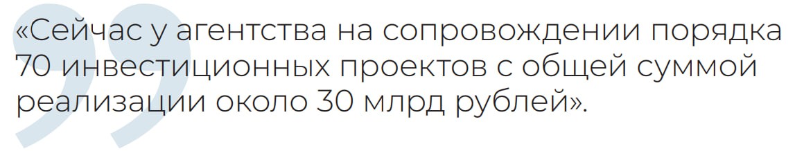 – Основой структуры системы поддержки инвестиций как раз являются его элементы. В первую очередь, «Агентство инвестиционного развития». Это единая структура, которая предназначена для сопровождения всех инвесторов, которые желают воспользоваться этими услугами: получить поддержку, консультации или полное сопровождение своей инвестиционной деятельности от идеи проекта до его реализации. Сейчас у агентства на сопровождении порядка 70 инвестиционных проектов с общей суммой реализации около 30 млрд рублей.