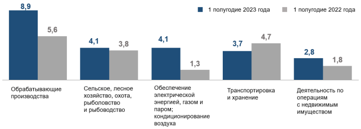 Самыми привлекательными для инвестирования отраслями стали обрабатывающие производства – в сферу вложили 8,9 млрд рублей, сельское, лесное хозяйство, охота, рыболовство и рыбоводство – 4,1 млрд рублей, обеспечение электроэнергией, газом и паром – 4,1 млрд рублей, транспортировка и хранение – 3,7 млрд рублей, деятельность по операциям с недвижимостью – 2,8 млрд рублей.