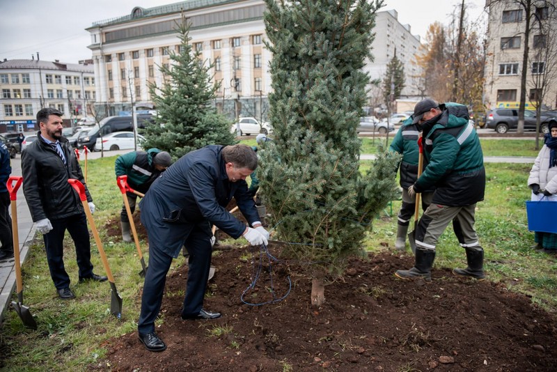 Это символичный подарок городу Кирову к 650-летию. Взрослые голубые ели привезены в регион благодаря договоренности Александра Соколова и руководства Кабардино-Балкарии.