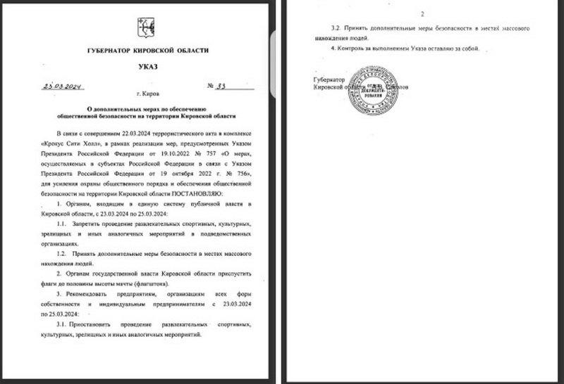Такое решение принял глава региона в связи с трагическими событиями в Москве Губернатор Кировской области Александр Соколов подписал указ об усилении мер по обеспечению общественной безопасности в регионе.