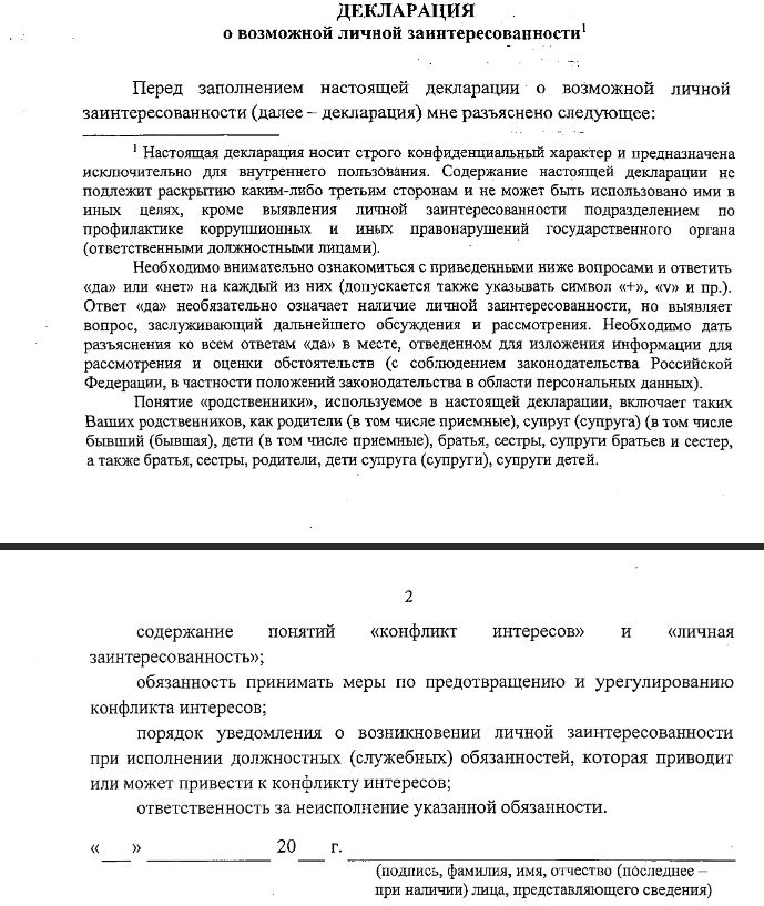В документе указано, что декларация носит строго конфиденциальный характер, предназначена исключительно для внутреннего пользования. Ее содержание не разглашается каким-либо третьим сторонам и не может быть использовано ответственным должностным лицом подразделений по профилактике коррупционных и других правонарушений кроме выявления личной заинтересованности.