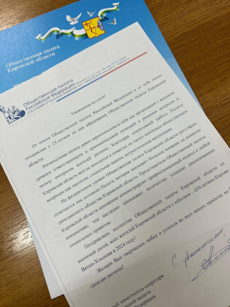 В письме отмечается, что Общественная палата Кировской области зарекомендовала себя как организация с высоким уровнем ответственности и принципиальной позицией в решении вопросов, направленных на защиту интересов жителей региона. На федеральном уровне палата регулярно выделяется как активный участник, оказывающий значительное влияние на развитие гражданского общества в Кировской области.