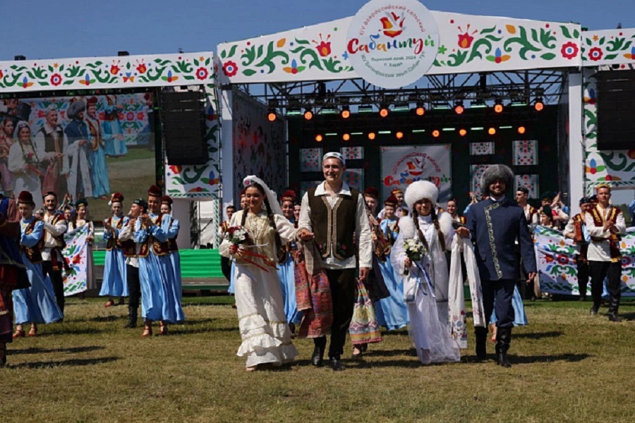 Вместе с пермским губернатором высокие гости посетили площадки празднования, участвовали в чествовании семейных пар с 50-летним стажем и вручили им подарки. А также в бракосочетании молодых русской, татарской и башкирской пар.