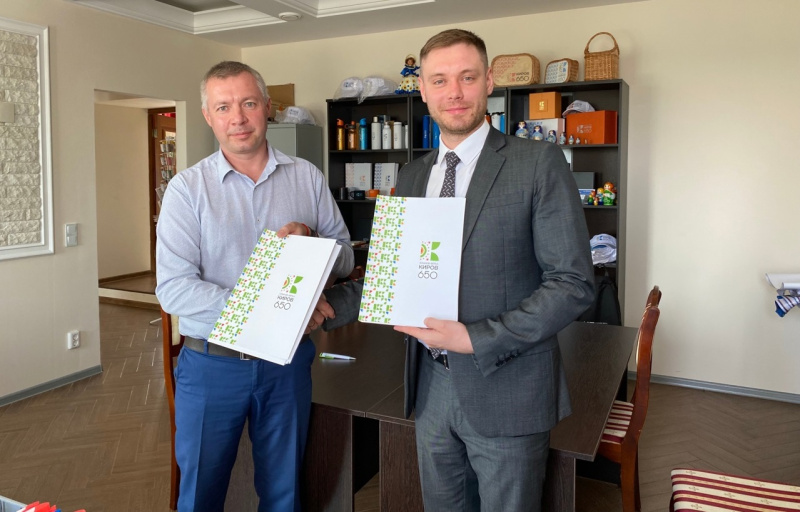 Директор КОГАУ «МФЦ» Николай Нагаев и руководитель Дирекции по организации 650-летия города Кирова Алексей Чепцов подписали соглашение о праве на использование фирменного логотипа «650 Киров».