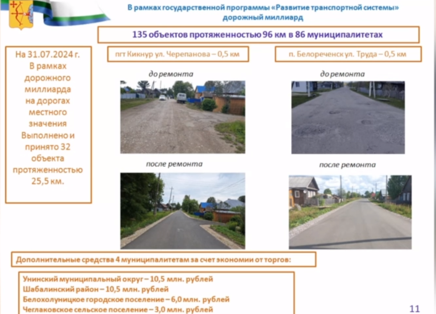 По губернаторской областной программе «дорожный миллиард» работы должны завершиться в сентябре. Закончены ремонты указанных населением участков в 18 населенных пунктах из 86. В них в порядок приведено в общей сложности 25,5 км автодорог, в том числе 35 объектов из 135 введены в эксплуатацию. Александр Соколов отметил, что жители поверили, что их голос имеет значение в принятии решений, и главам муниципалитетов это необходимо поддерживать. Где будет больше голосов, тем область будет больше помогать.