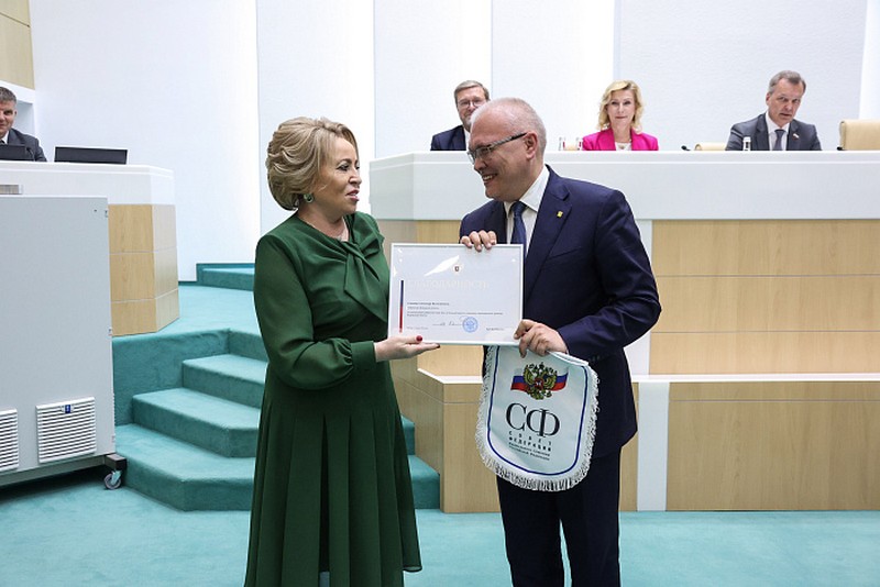 За добросовестный труд и вклад в развитие Кировской области глава региона получил благодарность от Валентины Матвиенко. Она же передала губернатору памятный вымпел. Он будет напоминать о результативных Днях Кировской области в высшей палате парламента России.