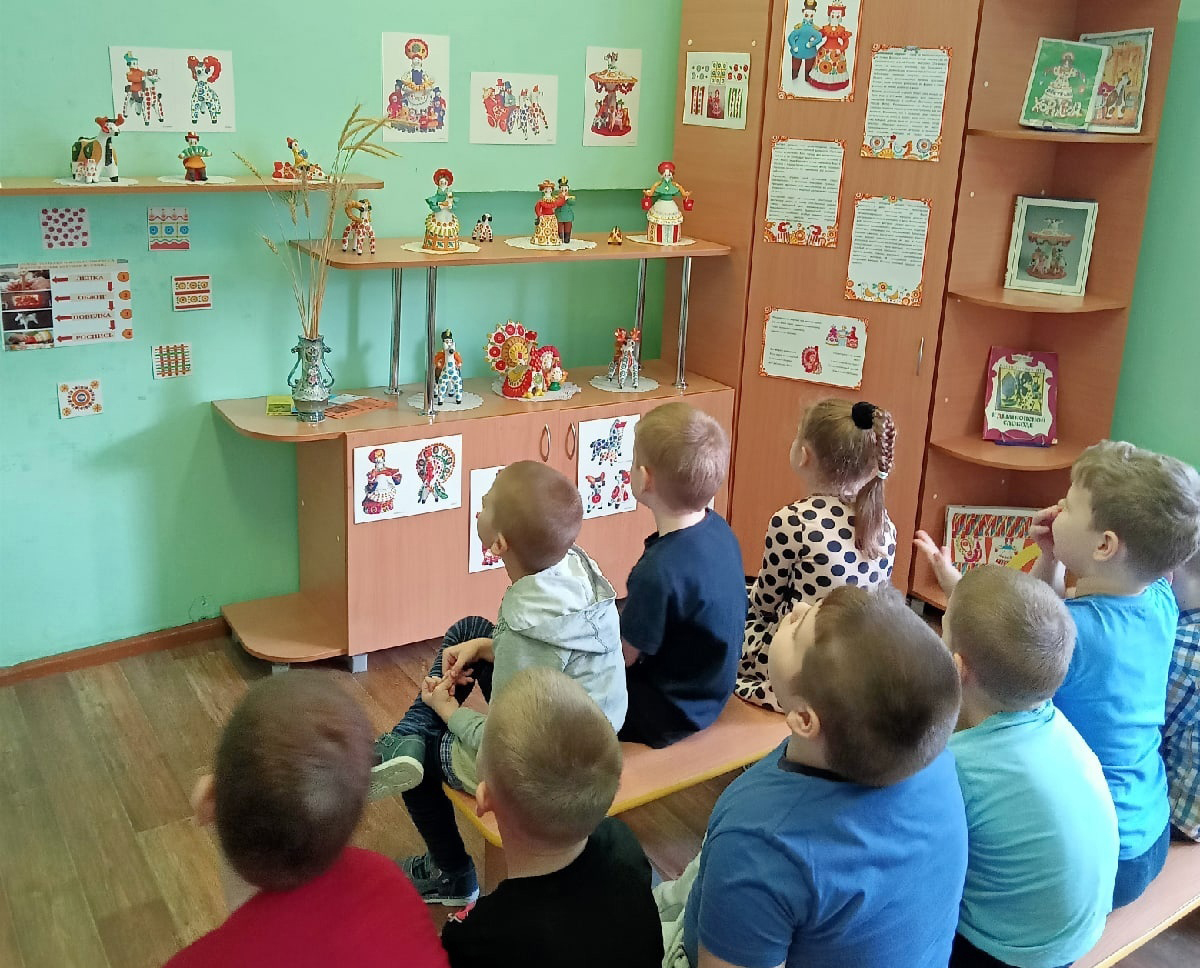 Дети узнают ее историю: возникла в слободе Дымково, ныне входящей в городскую черту Кирова, стала одним из символов Кировской области. Дымковская игрушка - изделие ручной работы из глины. Ее изготовление от лепки до росписи — процесс творческий, никогда не повторяющийся: нет и не может быть двух абсолютно одинаковых игрушек. Ребята узнали, что эта яркая игрушка не любит «одиночества» - художницы создают целые композиции, что выставляется «дымка» по всему миру: от США до Японии, что в нашем городе тоже есть дымковские мастерицы.