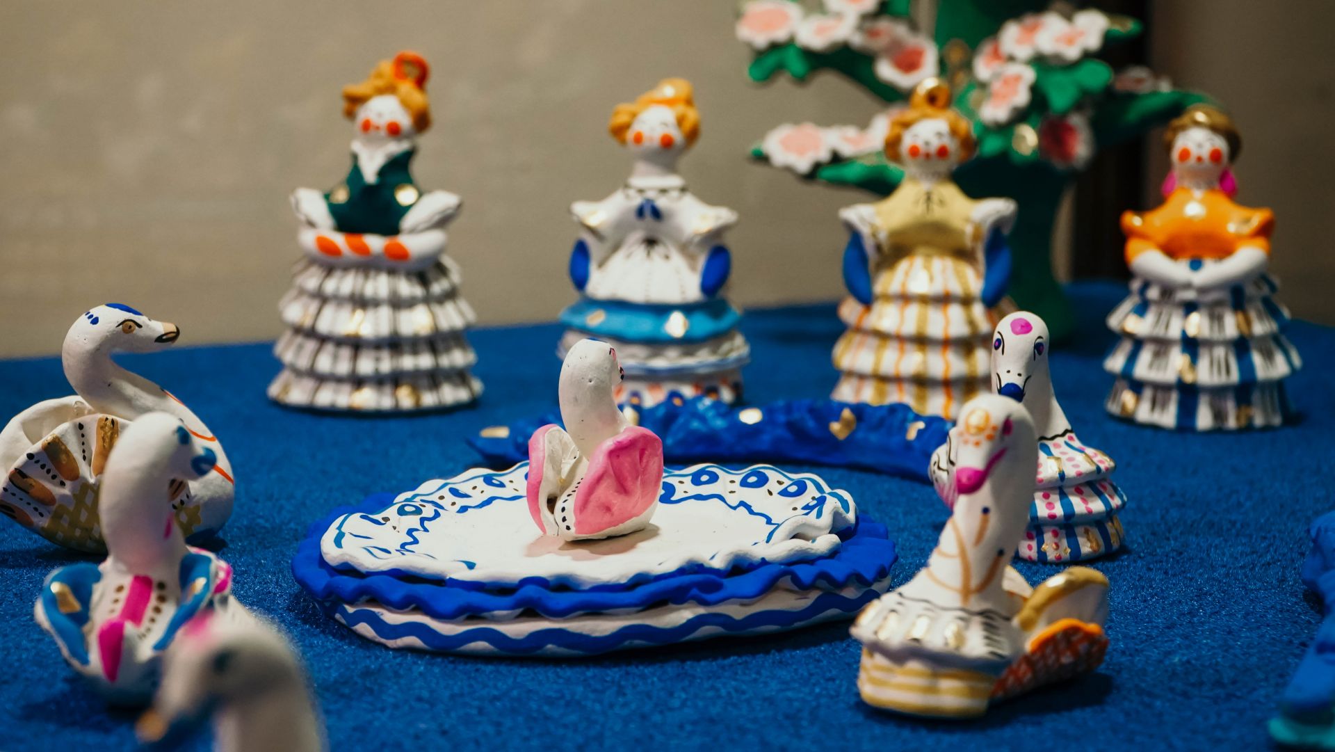— Среди них белые лебеди и главная героиня – принцесса Одетта. Ротбарт, колдун, в образе человека с головой петуха. Черный лебедь - Одиллия. Барыни в плиссированных белых юбках - балерины в пачках. Объединяющим элементом композиции выступает озеро с берегами, выполненное из традиционных дымковских лепных оборок, — поделились в музее.