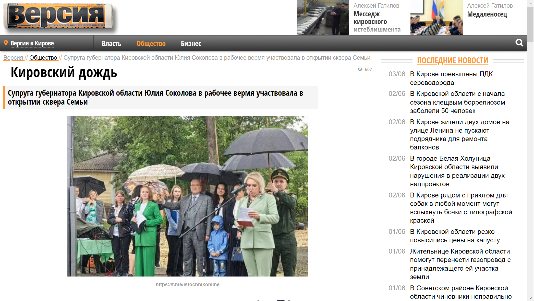 Возможно, местные паблики и телеграмм-каналы хотели сделать акцент на джентльменских манерах губернатора и сообщить об этом широкой общественности. Правда, прикрывая от дождя ведущую, губернатор сам под каплями не стоял, пользуясь услугами помощника - наверное, тоже джентльмена. Что ж, занятная картина и не более. Но нашлись и те, кто задался совершенно иным вопросом — почему это недавно трудоустроенный проректор по медиа и социальным коммуникациям ВятГУ Юлия Ильдусовна Соколова в рабочее время посещает мероприятия, который к деятельности учебного заведения отношения не имеют? В частности, на это обратил внимание лидер фракции КПРФ в Законодательном Собрании Кировской области Сергей Мамаев.