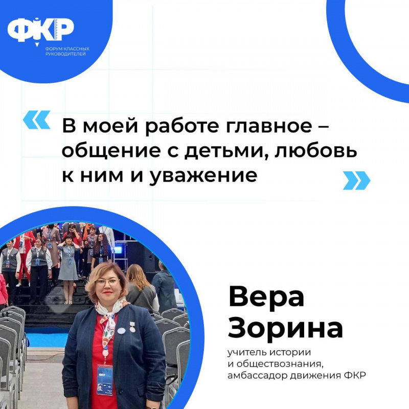 Среди первых амбассадоров оказалась учитель истории и обществознания из Кирово-Чепецка Вера Зорина. Когда она узнала о первом Форуме, сразу подала заявку и активно общалась с коллегами по всей России. В 2021 году принимала участие только заочно. А уже через год Вера Зорина прошла отбор и получила приглашение на очный этап в Москве.