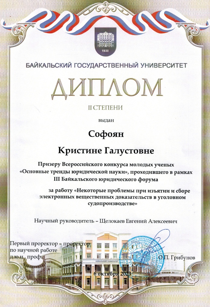 Диплом II степени вручен Кристине Софоян за работу «Некоторые проблемы при изъятии и сборе электронных вещественных доказательств в уголовном судопроизводстве». Научный руководитель студентки — преподаватель кафедры уголовно-процессуального права и криминалистики Волго-Вятского института Евгений Щелокаев .