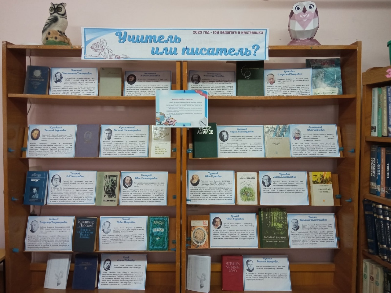 В залах Центральной межпоселенческой библиотеки им. А.Л. Алейнова оформлены выставки «Педагог - не звание, педагог призвание», «Учитель или писатель?», посвящённые Году педагога и наставника, представляющие литературу о педагогах,