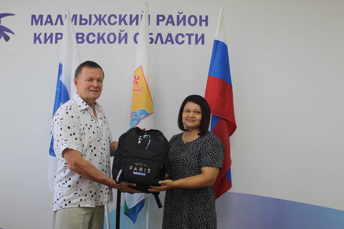 На днях в Малмыж приезжал Александр Бобров - помощник депутата Государственной Думы Олега Валенчука. Он вручил рюкзак со школьными принадлежностями семье Мухлисовых из с. Калинино.
