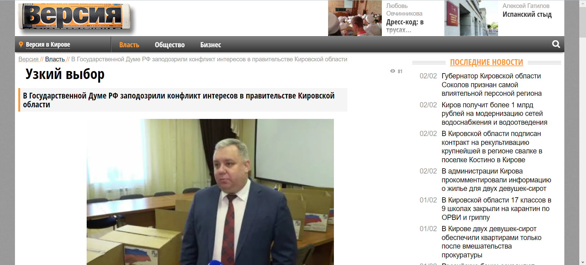 Непосредственным руководителем Алексея Комарова является губернатор Кировской области Александр Соколов. Если изменения в закон несут, а прокуратура после проведения проверки придет к выводу о нарушении федерального законодательства и подтвердит наличие конфликта интересов в ситуации с назначением Комарова на высокую должность в региональном правительстве, готов ли губернатор Кировской области добровольно уйти в отставку или быть отрешенным от должности по утрате доверия? Выбор у обоих чиновников, в общем-то, не велик.