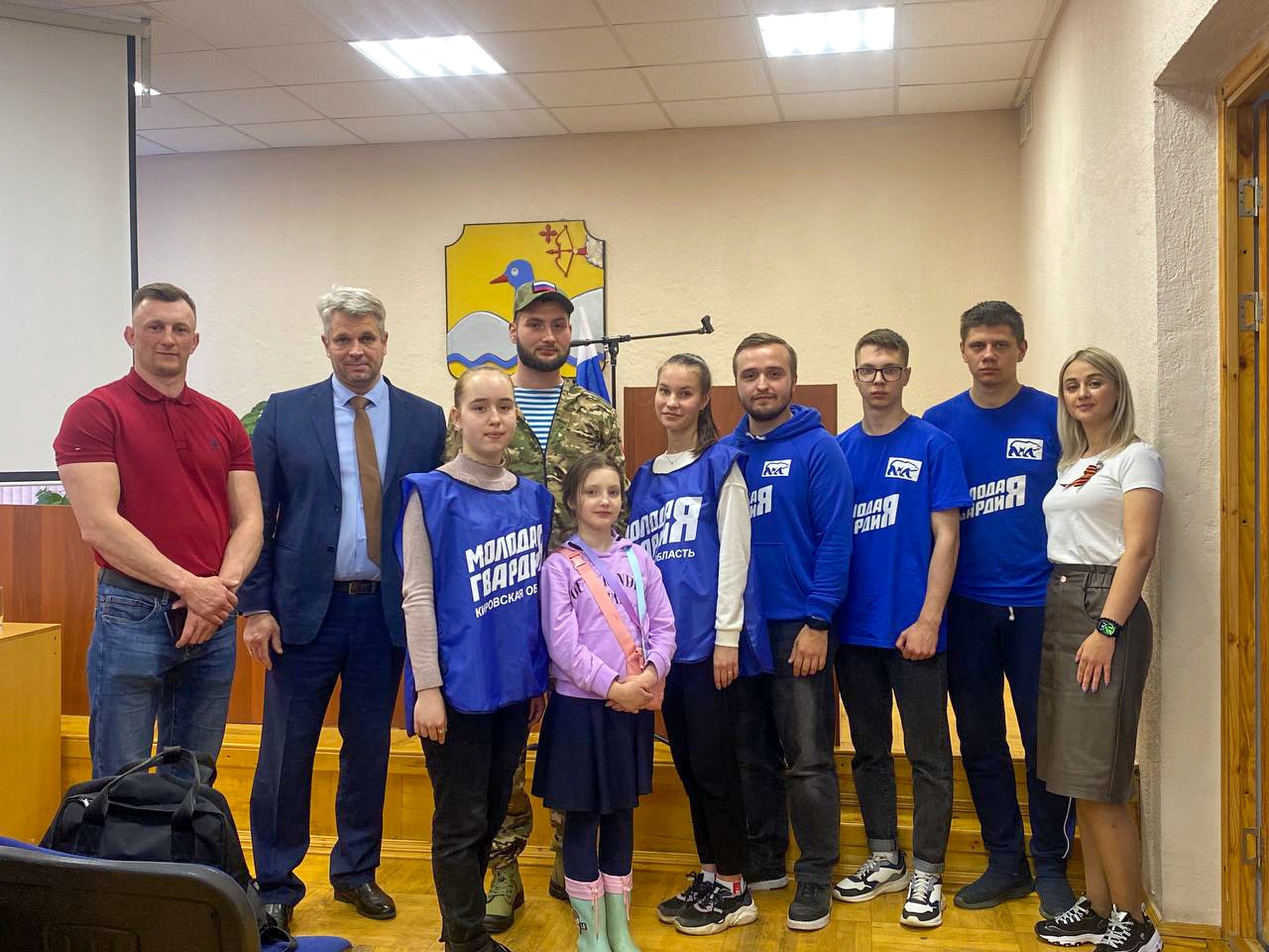 Активисты Кировского регионального отделения «Молодой Гвардии» в зале администрации Верхошижемского района приняли участие во встрече учащихся старших классов Верхошижемской, Среднеивкинской, Угорской школ с участниками специальной военной операции.