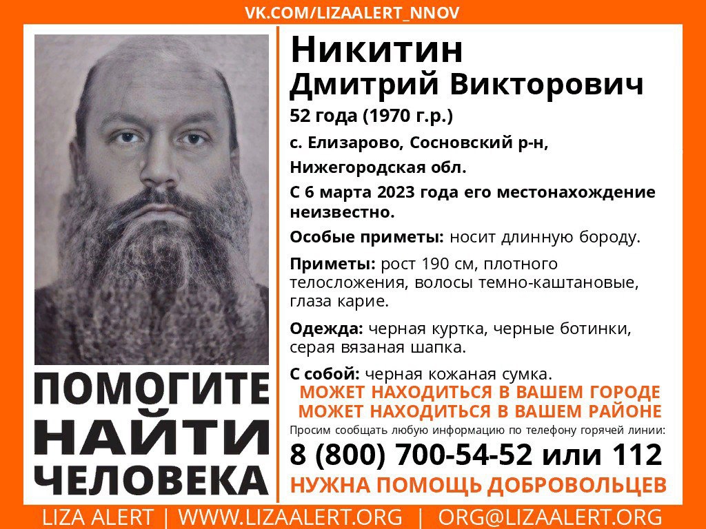 Поиски Дмитрия Никитина ведутся с 6 марта — именно в тот день его видели последний раз. Приметы пропавшего : рост 190 сантиметров, плотное телосложение, глаза карие, волосы темно-каштановые. Носит длинную бороду. На момент ухода мужчина был одет в черную куртку, на ногах ботинки того же цвета, на голове – серая вязаная шапка. С собой была черная кожаная сумка.