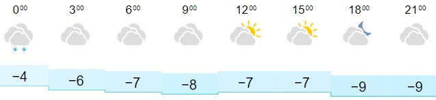 Температура воздуха в городе составит от -4 до -9 градусов ртутного столба. Ночью в Кирове ожидается от -4 до -7, утром станет на градус холоднее, будет пасмурно. Днем термометр вновь будет показывать отметку -7 градусов. Кроме того, днем кировчан может обрадовать возможный выход солнца. К вечеру температура воздуха опустится до -9 градусов. Ветер подует с севера, юга, запада и юго-запада скоростью от 1 до 8 метров в секунду.