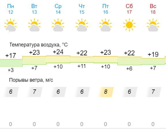 Со вторника, 13 июня, по пятницу, 16 июня, в Кирове не будет резких перепадов температур воздуха . Столбик термометра днем покажет от +22 до +24 градусов Цельсия. В ночное время минимальная температура воздуха будет в ночь на вторник. Синоптики предупреждают о температуре +3 градуса Цельсия. Со среды, 14 июня, по пятницу, 16 июня, в Кирове установится температура воздуха от +10 до +11 градусов Цельсия. К следующим выходным "уличные" температуры вновь пойдут на спад . В воскресенье температура воздуха днем будет на уровне +19 градусов. Ночи в выходные станут прохладнее: метеорологи прогнозируют температуры от +6 до +7 градусов Цельсия. Максимальные порывы ветра достигнут восьми метров секунду . Преимущественно на неделе порывы ветра будут держаться на уровне шести метров в секунду.