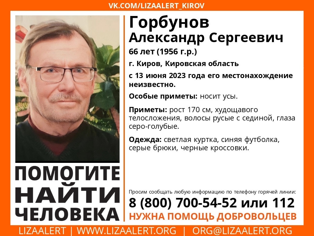 В городе пропал 66-летний Александр Сергеевич Горбунов. Последний раз его видели 13 июня, с тех пор информации о его местонахождении нет. Активистам отряда нужда помощь кировчан в распространении ориентировки по сети.