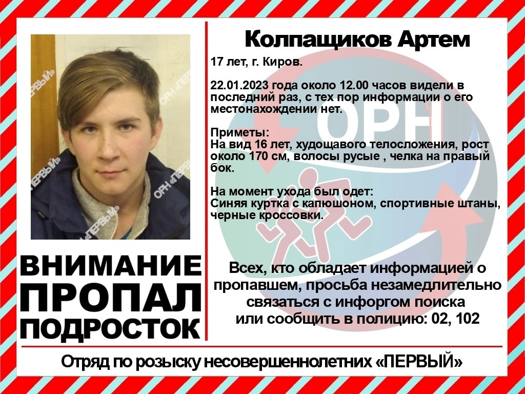 В Ленинском районе Кирова пропал без вести 17-летний Артем Колпащиков. С полудня 22 января о его местонахождении ничего не известно.