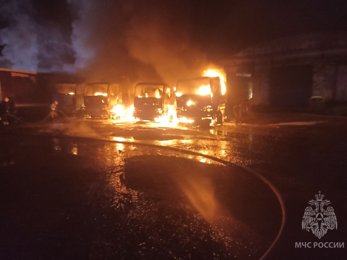 Как сообщили в ведомстве, в результате пожара огнем уничтожено четыре грузовых автомобиля, еще два повреждены огнем. По оперативным данным, пострадавших на пожаре людей нет.