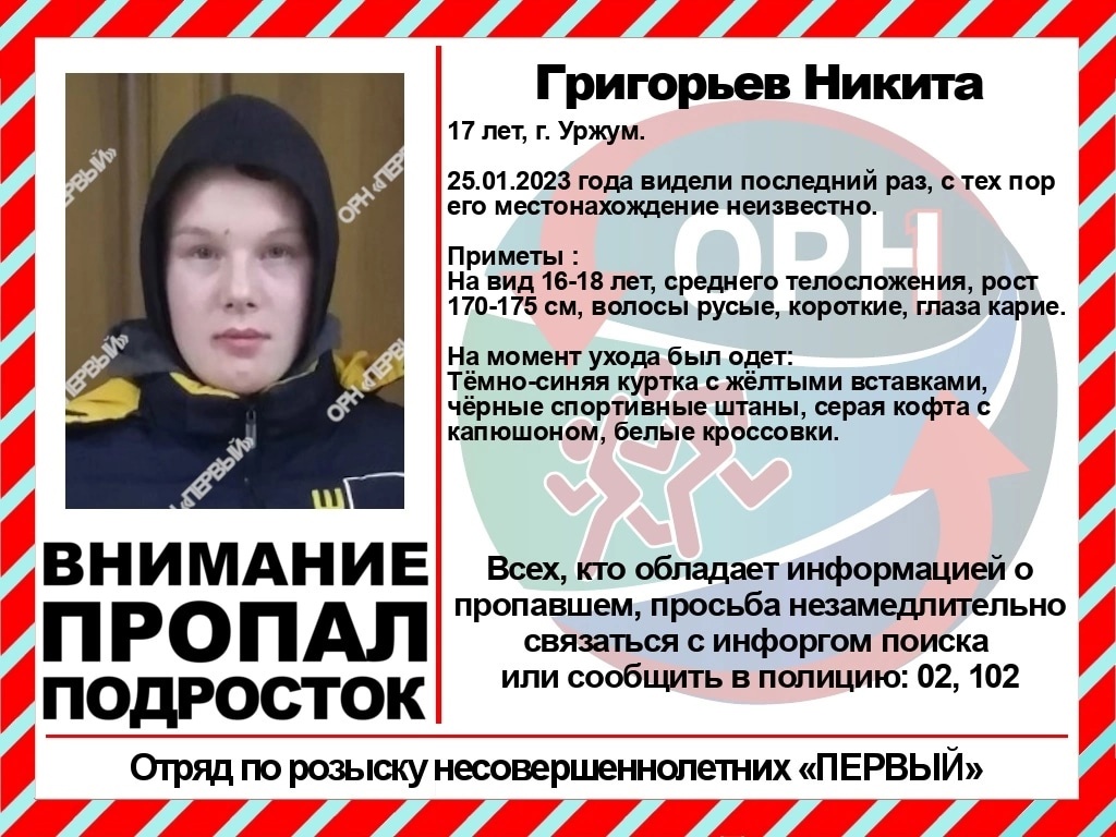 В группе отряда по розыску несовершеннолетних “Первый” сообщили о поисках 17-летнего Никиты Григорьева из Уржума.