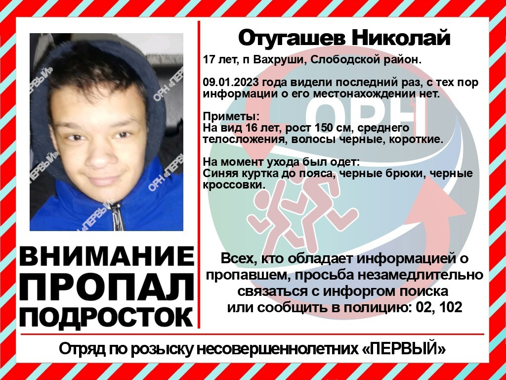Вчера, 9 января, пропал Николай Отугашев. 17-летнего молодого человека видели последний раз в селе Вахруши.