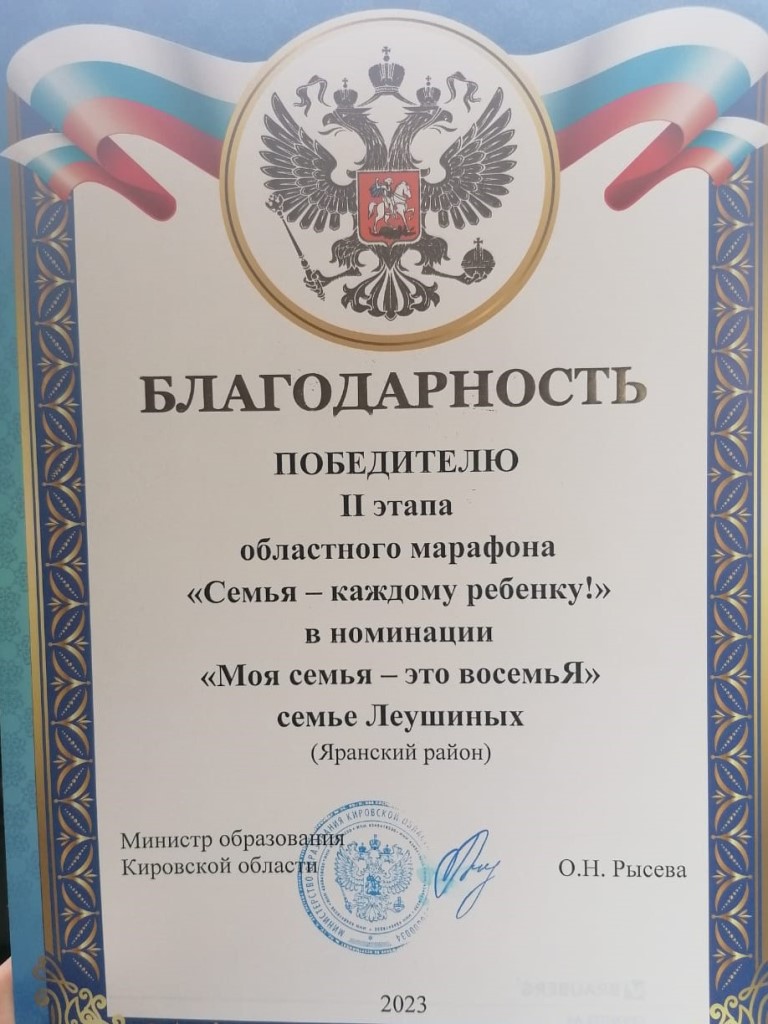Приемная семья из Яранского района награждена Благодарностью и ценным подарком Министерства образования Кировской области за победу в номинации «Моя семья-это восемьЯ».