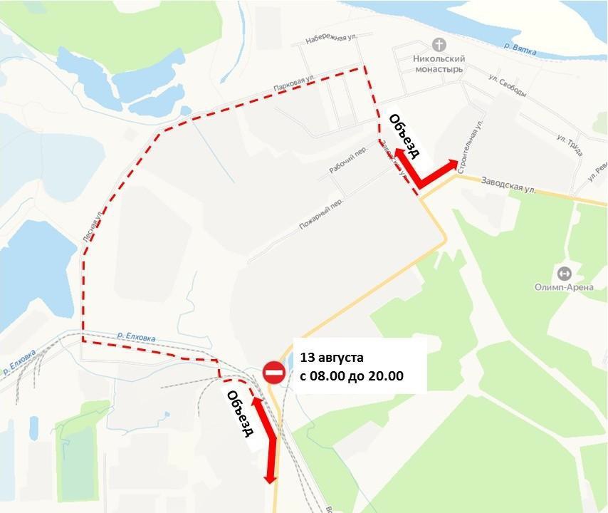 В связи с проведением работ по устройству защитных конструкций подмостовых коммуникаций 13 августа с 08.00 до 20.00 будет ограничено движение транспортных средств в районе моста через р. Елховка (автомобильная дорога от ВПЧ-1 до поста № 2 города Кирово-Чепецка).