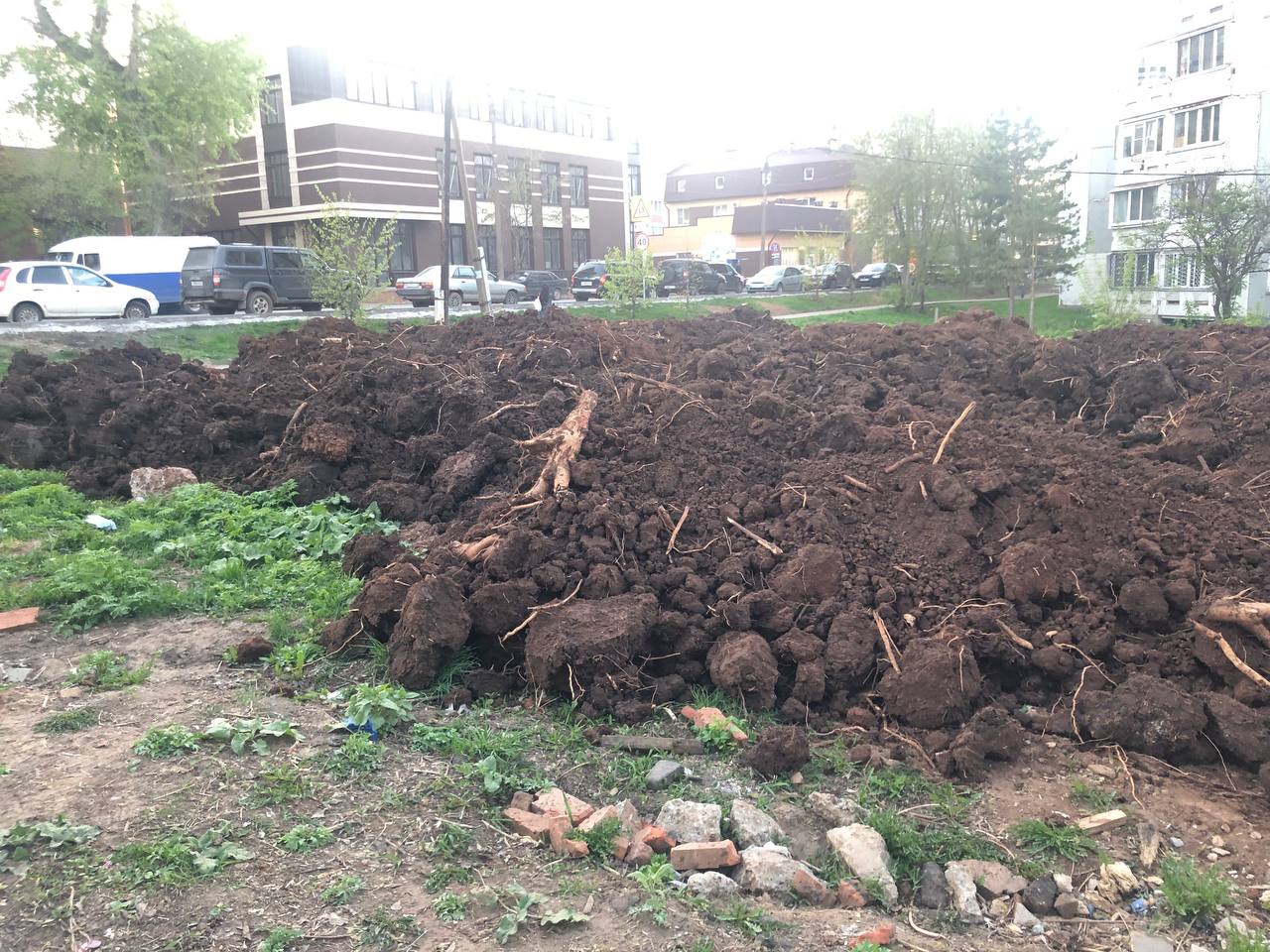 11 мая в Никитский сквер на перекрестке улиц Володарского и Советской приехали неопознанные самосвалы, полные земли, смешанной с корнями деревьев,