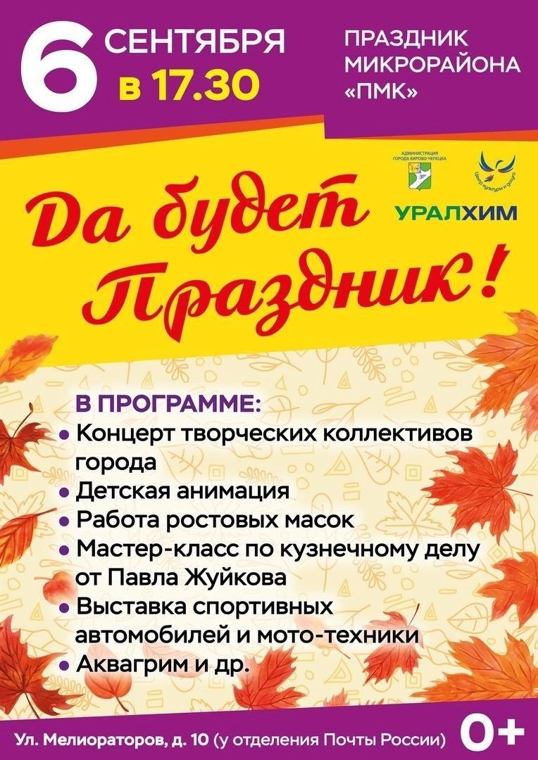 6 сентября впервые в рамках Дня города состоится праздник в микрорайоне ПМК. Место проведения: улица Мелиораторов, дом 10 (на площадке у отделения Почты России).