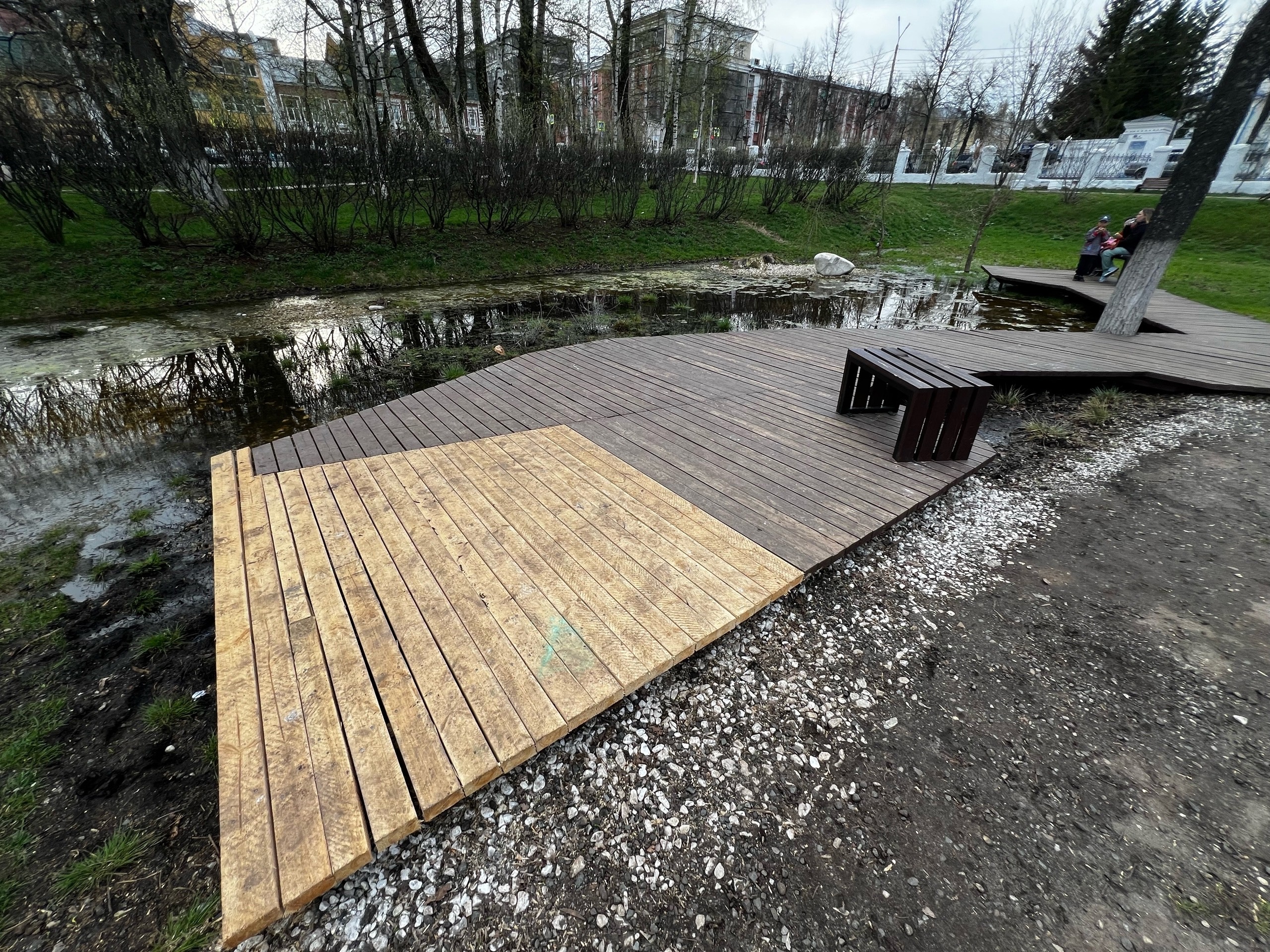 Главный нюанс тут же бросается в глаза - цвет досок, из которых выполнен разрушенный элемент дождевого сада отличается от цвета тех, из которых сделана его основная часть. Наши читатели предполагают, что новые доски могут быть не обработаны антисептическим средством и, соответственно, могут оказаться не влагостойкими и быстро сгнить. Еще одна претензия - геометрия досок, которая отличается от основной части дождевого сада.