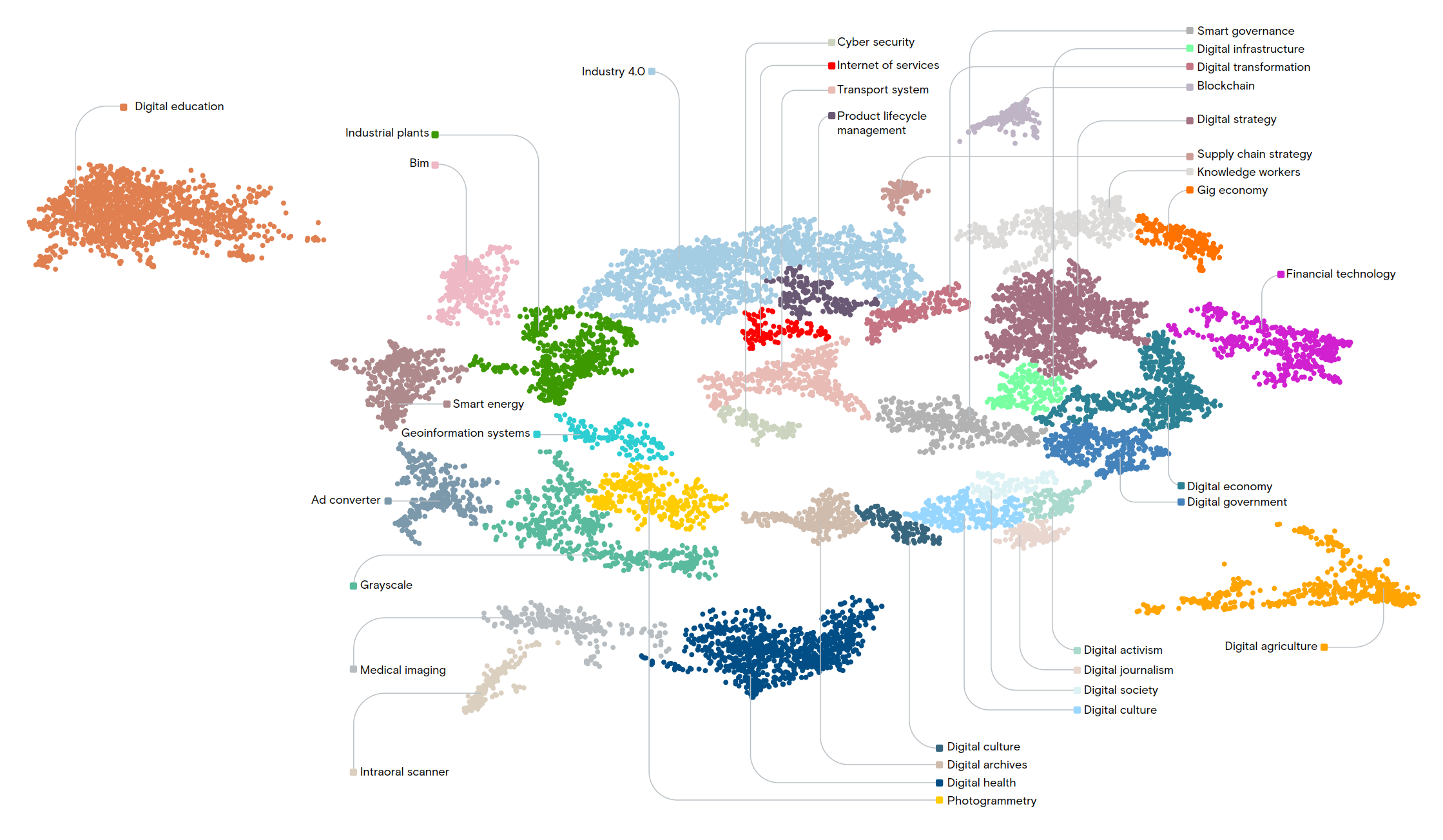 Искусственный интеллект (Artificial Intelligence). Альтернативная энергетика (Alternative energy). Мобильные сети (Mobile networks). Цифровое здравоохранение (e-Health). Изучение рака (Cancer research). Вычислительная биология (Computational biology). Интеллектуальный анализ данных (Data mining). Социальные сети (Social Media). Информационная безопасность (Information security). Робототехника (Robotics). Мобильные сети пятого поколения (5G). Электронная коммерция (e-Commerce). Мобильные платформы (Mobile platforms). Компьютерные игры (Computer games). Приложения на операционной системе Android. Блокчейн (Blockchain). Беспилотные автомобили (Autonomous vehicles). Облачные технологии (Cloud). Спутниковая связь (Satellite). Приложения на операционной системе iOS.«За пять лет мы накопили колоссальный объем данных, который позволяет анализировать важнейшие технологические тренды в различных разрезах. Если первый мониторинг основывался на 5 млн источников, то премьерный — уже на более 117 млн. Сравнение данных за разные годы показывает пути развития технологий: какие из них получили наибольший импульс развития и внедрения, а какие перешли в разряд аутсайдеров. За теми, кто оказался “на обочине”, следить не менее интересно: что-то появилось раньше своего времени, а что-то вытеснено новым поколением науки и техники. Бесспорным фаворитом этих своеобразных чемпионатов технологий в последние годы является искусственный интеллект: он оказывает сквозное влияние на огромное количество других трендов. И при подготовке самого мониторинга не обойтись без искусственного интеллекта, так как обработать миллионы источников данных иным способом невозможно. Наша работа может стать важным источником данных при разработке стратегий и принятии программных решений в самом широком круге отраслей», — отметил вице-президент по стратегическим инициативам «Ростелекома» Борис Глазков.