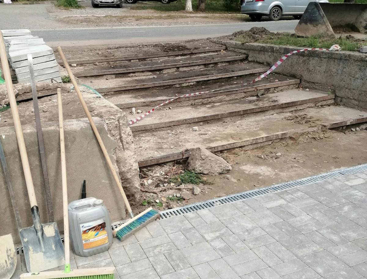 Сейчас завершаются работы по укладке тротуарной плитки, также будут проведены мероприятия по облицовке опорной стены, ремонту лестницы.