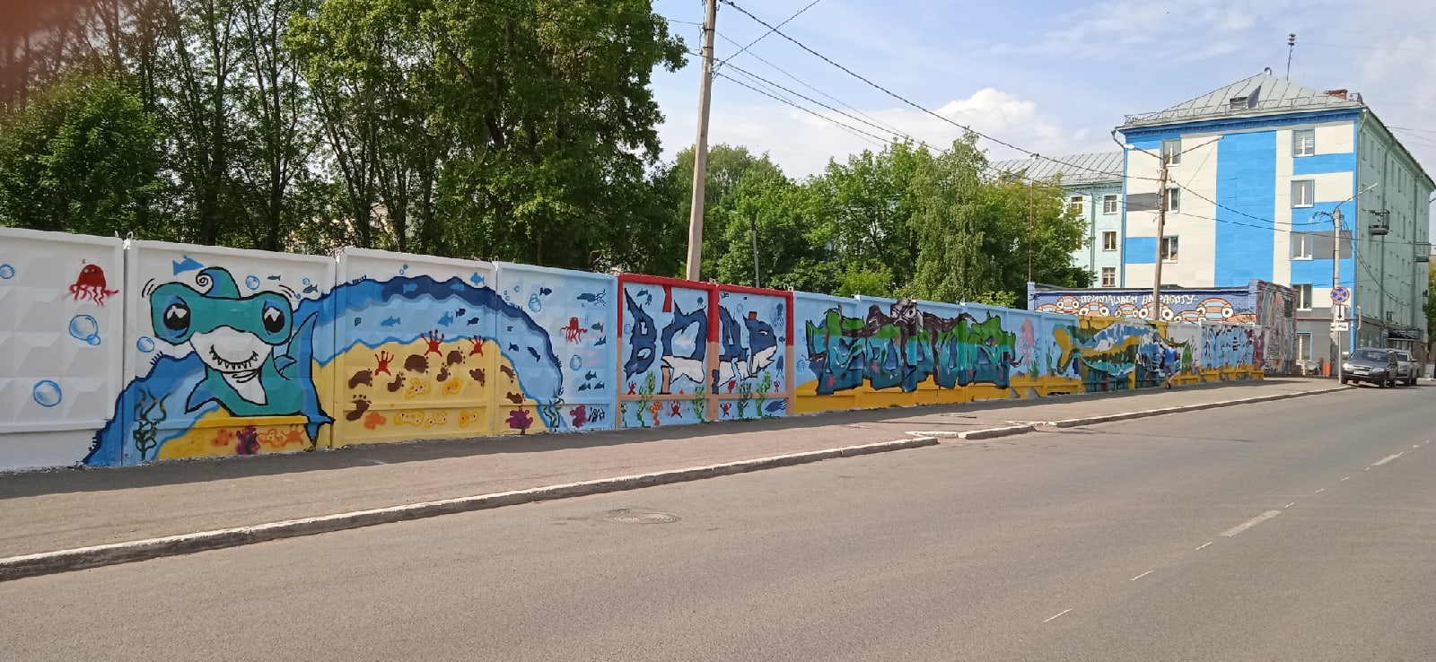 Огромный бетонный забор на улице Спасской между Октябрьским проспектом и Дерендяева традиционно притягивает кировских художников граффити. Однако на этот раз украсить его взялись не простые энтузиасты, а непосредственный владелец ограждения - МУП "Водоканал".