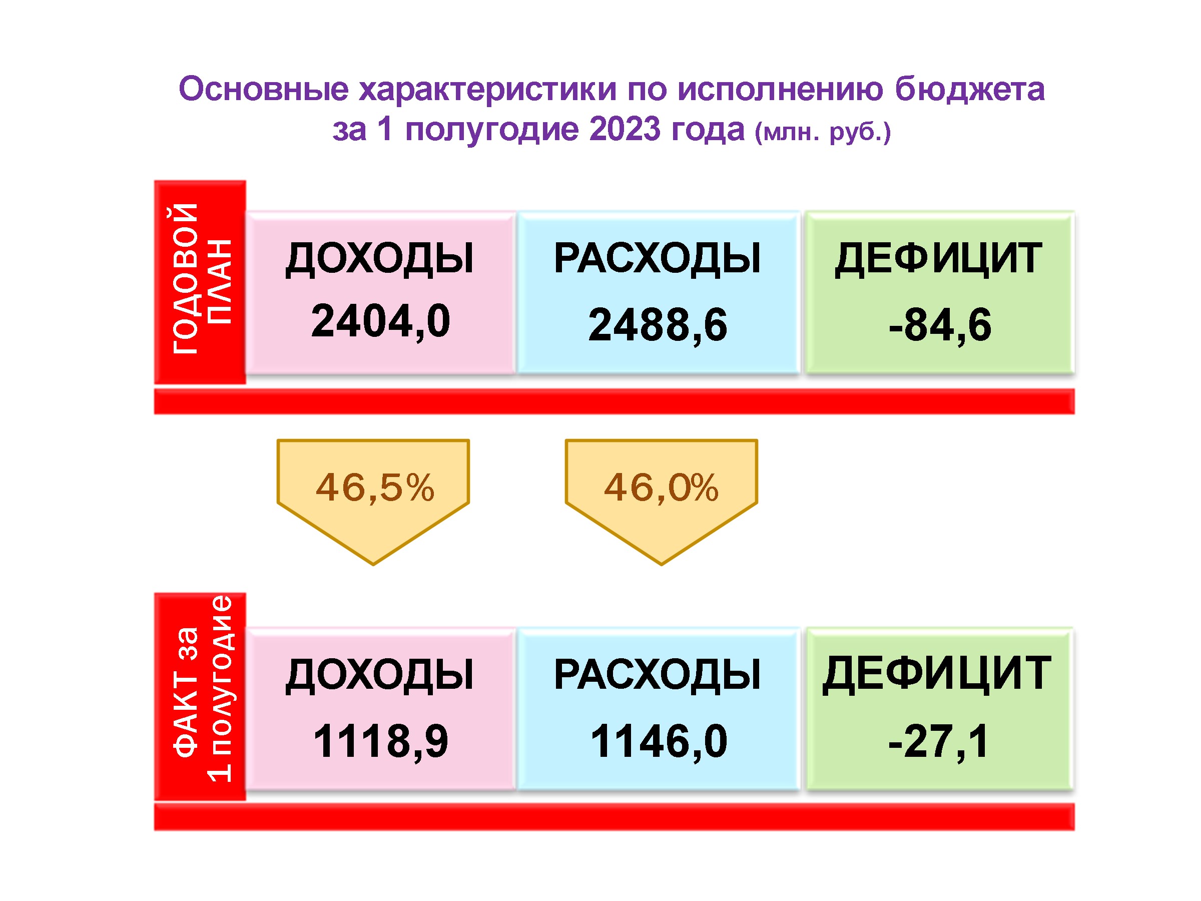 Годовой план по доходам в сумме 2404,0 млн. рублей выполнен на 46,5%. Поступление налоговых и неналоговых доходов составило 400,2 млн. рублей, или 47,3% от годового плана, безвозмездные поступления составили 718,7 млн. рублей, или 46,1%. Кассовый план по доходам за 1 полугодие 2023 года выполнен на 101,1%, в том числе по налоговым и неналоговым доходам на 102,7%. В 1 полугодии 2023 года доходов в бюджет муниципального образования поступило больше, чем в 2022 году на 351,2 млн. рублей или на 45,7% за счет увеличения безвозмездных поступлений на 320,9 млн. рублей или в 1,8 раза. Поступления налоговых и неналоговых доходов увеличились на 30,3 млн. рублей или на 8,2%.