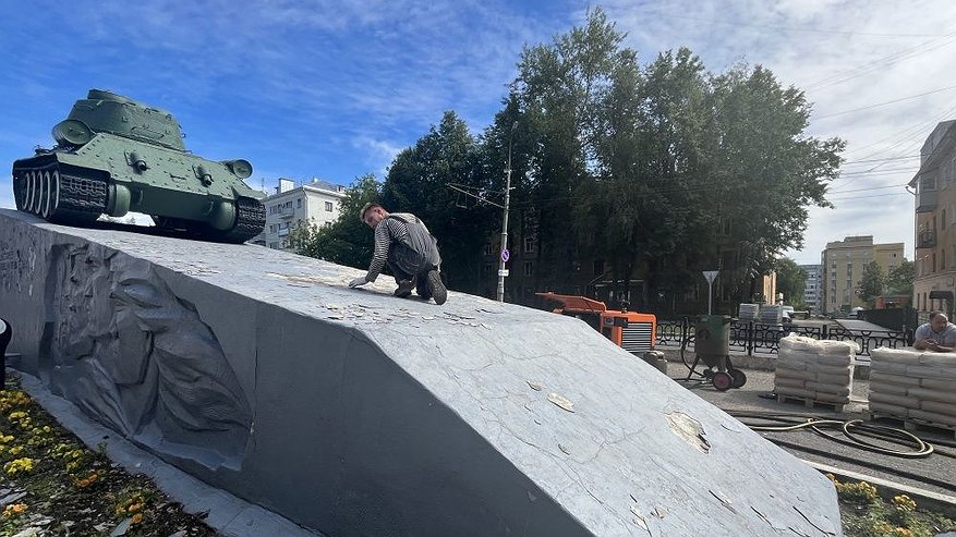 На Октябрьском проспекте рабочие из подрядной организации приступили к ремонту памятника героическому труду жителей области в годы Великой Отечественной войны «Кировчане - фронту». Этот монумент является объектом культурного наследия.