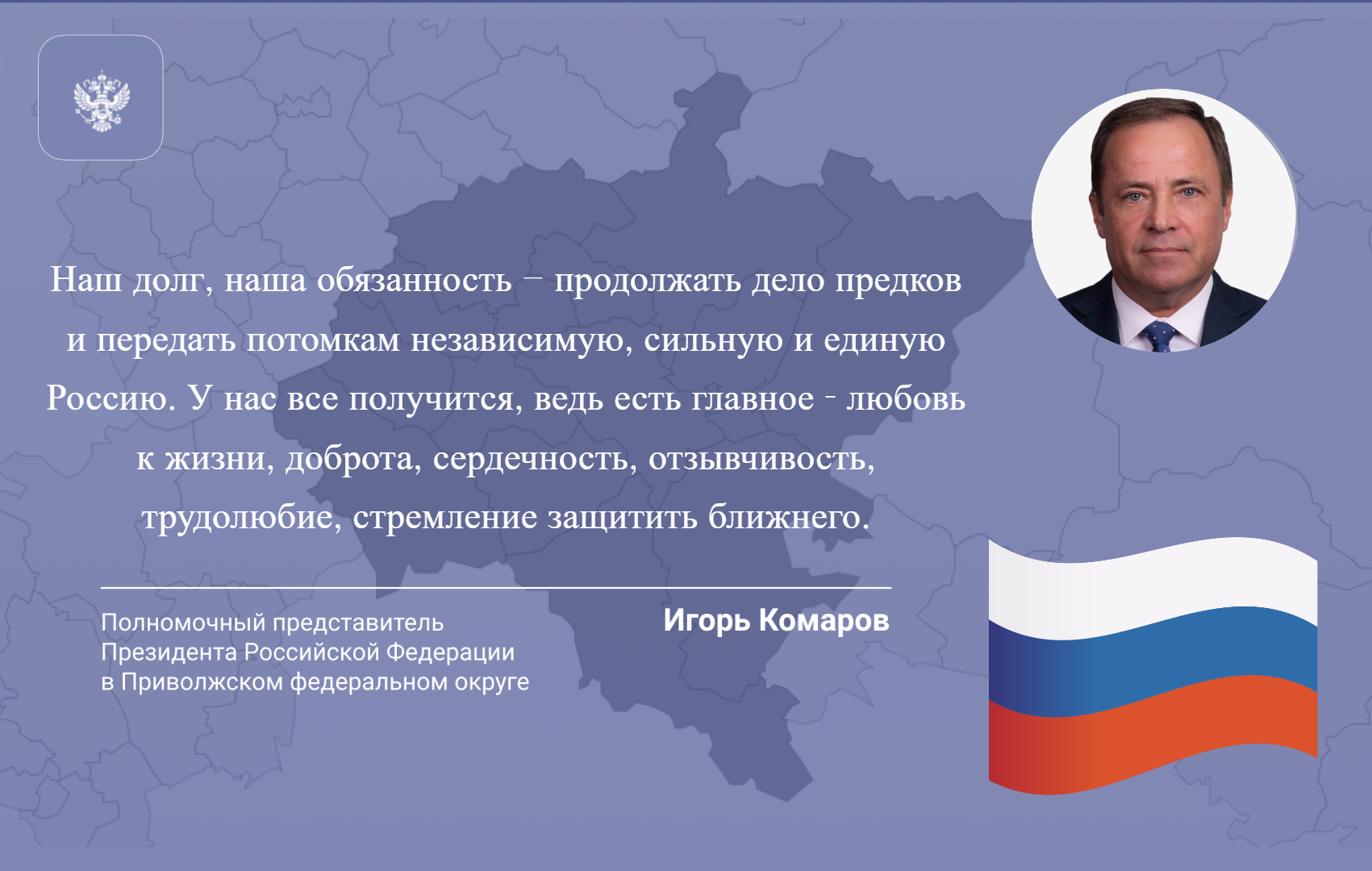 От всей души поздравляю всех жителей Приволжского федерального округа с Днем России! Это праздник нашего единения, любви к Отечеству, гордости за нашу Родину, за нашу историю и культуру. Это общий праздник тех, кто во все времена не жалея сил трудился и защищал нашу большую страну.