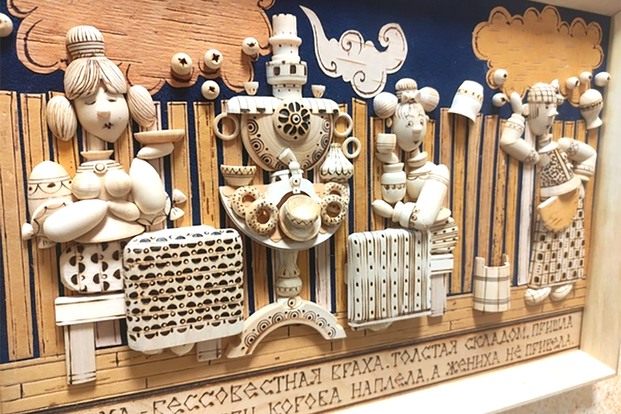 На выставке представлены панно, воссоздающие сказку Филатова «Про Федота-стрельца, удалого молодца», а также различные бытовые сюжеты. Каждое изделие украшено множеством мелких деталей, которые придают им особую привлекательность и загадочность. Погружаясь в атмосферу сказки, зрители ощущают волшебство, юмор и фантазии, которые пронизывают каждую работу.