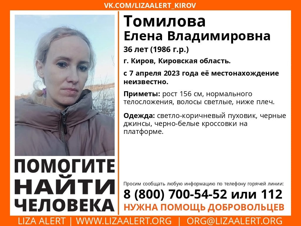Волонтеры поискового отряда "Лиза Алерт" сообщают о поисках 36-летней Елены Томиловой.