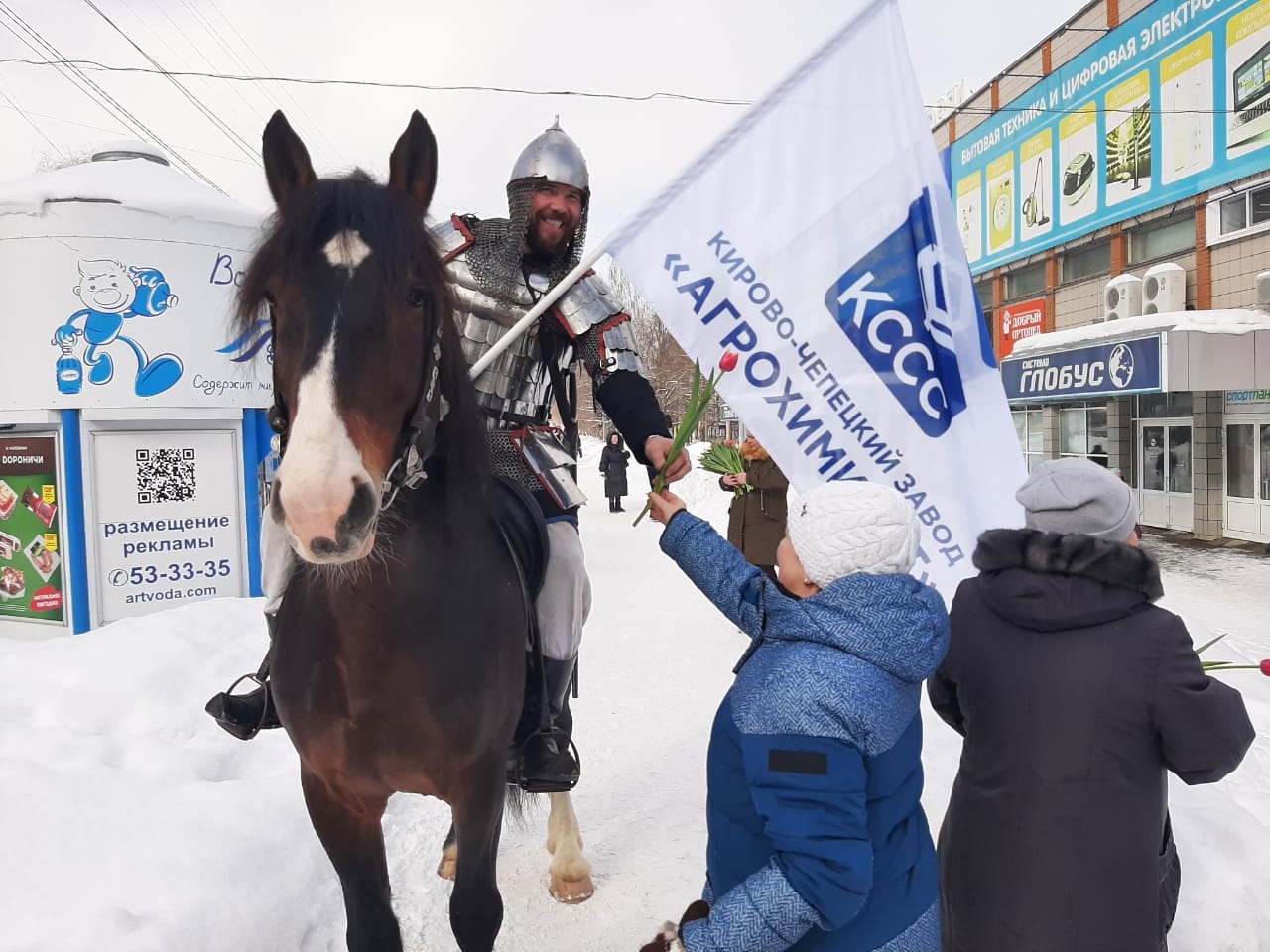 Об акцииНа улицах города внезапно появился всадник в доспехах (как позже выяснилось, вятский воевода). Он разгуливал по тротуарам, вручал дамам цветы и поздравлял их с наступающим 8 марта. Необычный персонаж вызвал живой интерес у всех прохожих, женщины были приятно удивлены оригинальным поздравлением, фотографировались и принимали презенты. По их словам, у многих вовсе не было настроения отмечать праздник, поэтому встреча с вятским воеводой оказалась как нельзя кстати, заряд положительных эмоций был обеспечен.