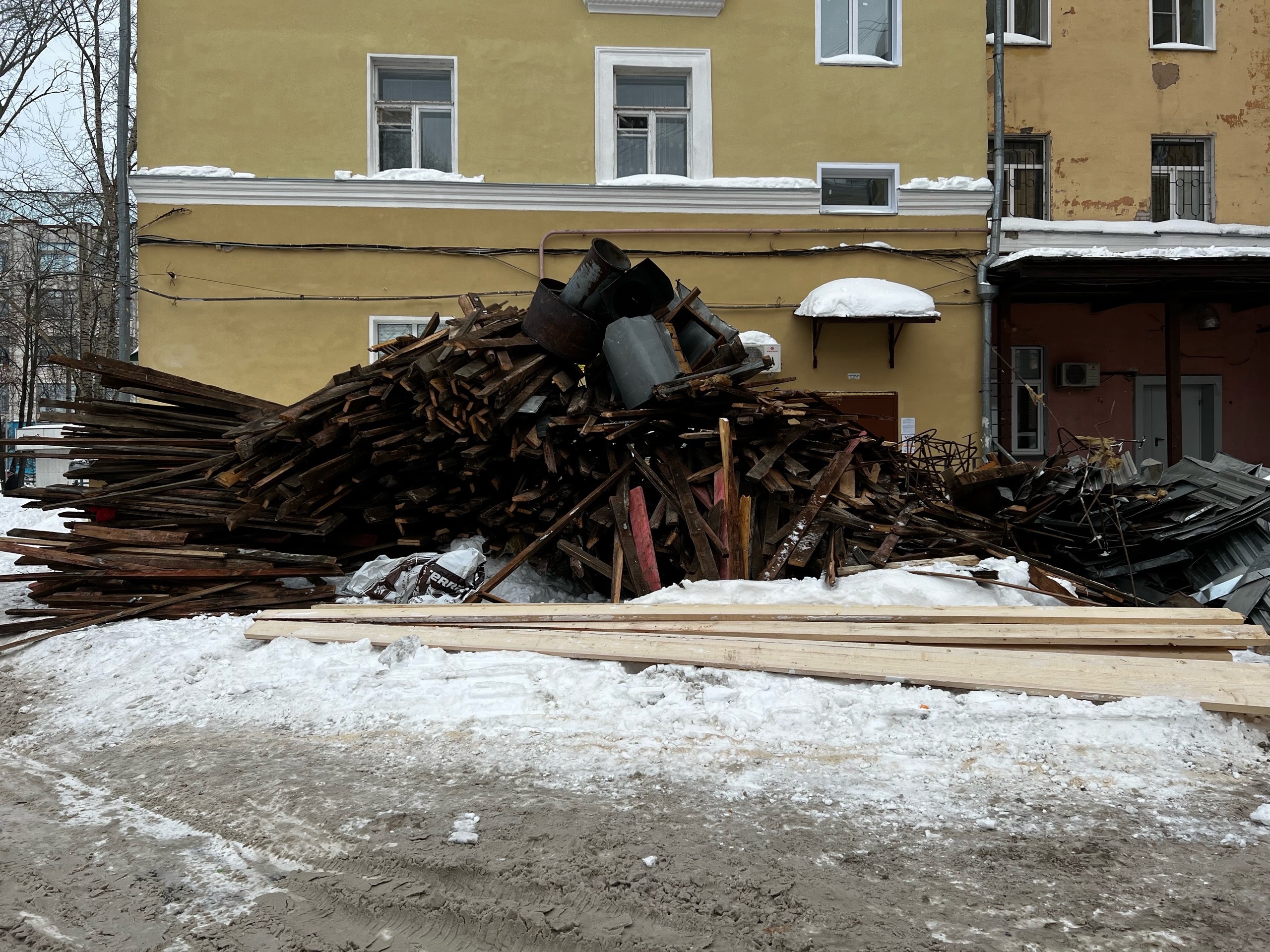 Еще одной проблемой стали кровельные материалы, а именно скользкий профнастил, который складирован рядом с кучей мусора и после обильных снегопадов скрылся под толщей снега. Наступая на него, жители дома поскальзываются и рискуют упасть. Многочисленные жалобы не дали результатов и в настоящее время куча строительного мусора лишь продолжает расти.