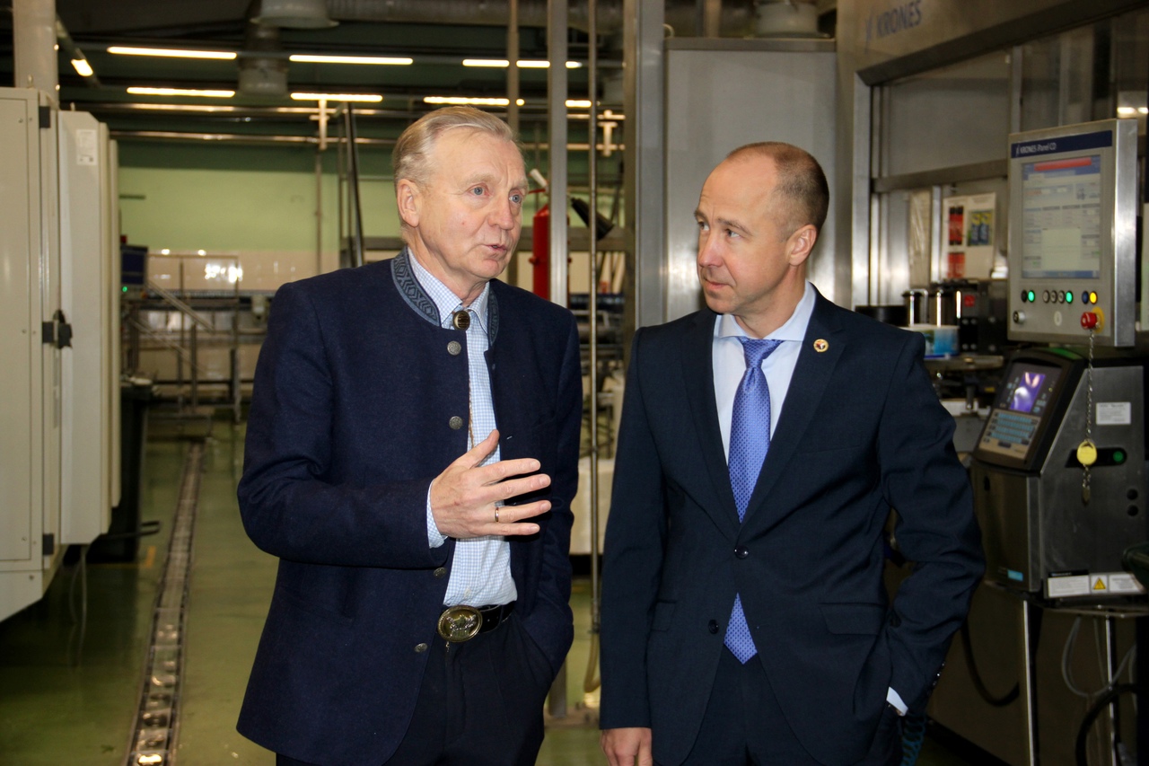 На кадрах фоторепортажа мы видим, как Андрей Усенко, одетый в официальный костюм, вместе с Председателем Совета директоров АО «Вятич» Николаем Курагиным идет по территории завода.