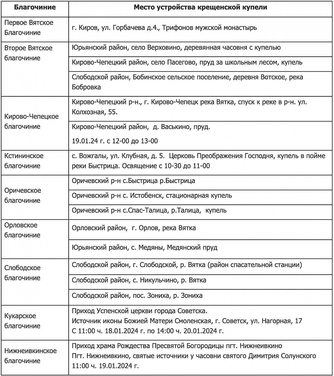 Пресс-служба Вятской Епархии дала информацию о том, где в этом году будут организованы Крещенские купели в Кировской области. В Кирово-Чепецком районе таких мест три.