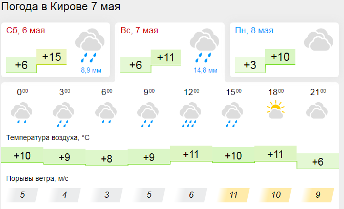 Снова пасмурная и дождливая погода, ветер усилится до 11 метров в секунду. Осадки ожидаются в течение всего дня. Температура воздуха ночью составит +9...+10 градусов, к утру столбик термометра остановится на отметке +9 градусов. Днем в Кирове - +11 градусов, к вечеру похолодает до +6 градусов.