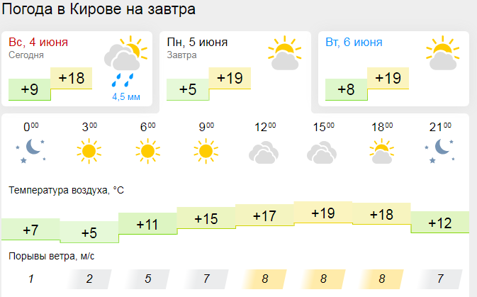 Ночная температура воздуха в Кирове составит +5...+7 градусов, к утру значительно потеплеет - столбик термометра покажет +11..+15 градусов. Дневная температура воздуха в Кирове достигнет +17..+19 градусов. К вечеру столбик термометра опустится до отметки +12 градусов.