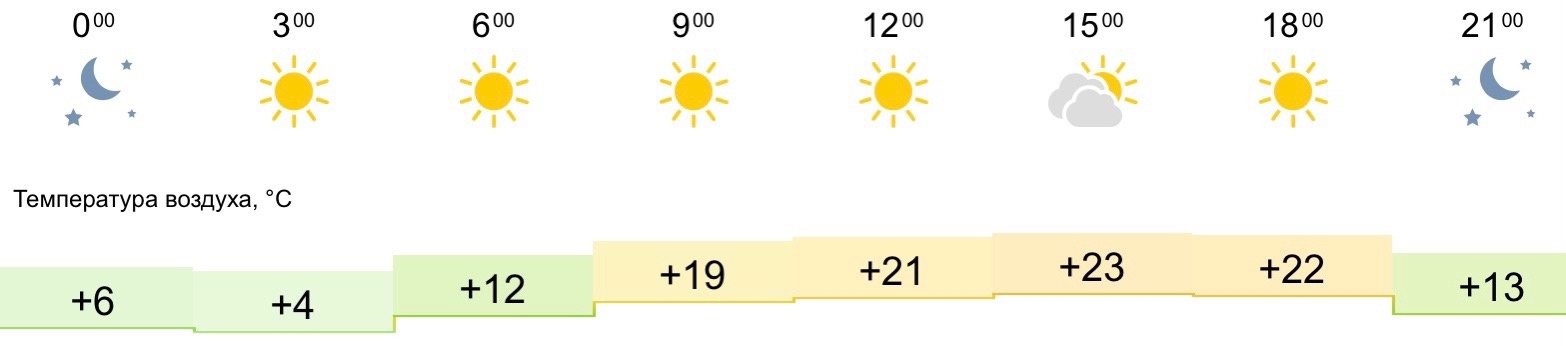 В Кирово-Чепецке на протяжении всего дня будет солнечно. Ранним утром температура воздуха составит +12 градусов, ближе к 09:00 на улице потеплеет до +19. Днем отметка на столбике термометра достигнет на +23 градусов. Ближе к вечеру прогнозируется небольшое похолодание до +13 градусов. Ветер подует с юга, запада и юго-запада со скоростью до семи метров в секунду.