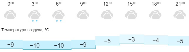 В течение всего дня будет пасмурно. Температура воздуха в городе будет колебаться от -3 до -10 градусов. С ночи до утра температура воздуха составит от -9 до -10 градусов, ожидается небольшой снег. Дневная температура воздуха составит от -3 до -5 градусов, к вечеру погода не поменяется.