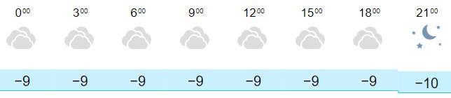 В Кирове на протяжении всего дня будет пасмурно, осадков не прогнозируется. Температура воздуха в городе будет колебаться от -9 до -10 градусов. Ночью температура воздуха в Кирове составит -9 градусов. Утром температура воздуха останется на той же отметке. К вечеру столбик термометра опустится до -10 градусов.
