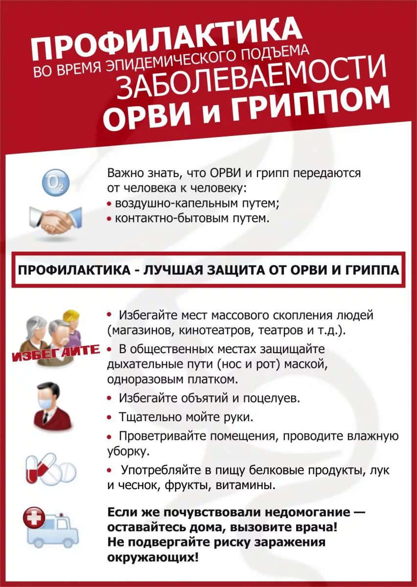 Возбудители острых респираторных вирусных инфекций и гриппа передаются от человека к человеку воздушно-капельным путем, достаточно контагиозны. При наличии признаков заболеваний – насморк, першение в горле, поднялась температура, общее недомогание, головная боль и т.д. – не следует посещать работу, учебное заведение, направлять ребенка в детский организованный коллектив, необходимо вызвать врача на дом.